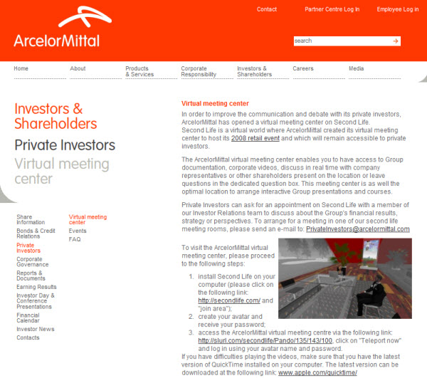 While browsing through some archives recently, I came across … ArcelorMittal using Second Life to hold retail investor meetings – or at least, to hold a mixed reality meeting, with some people present in real life, and others present in a virtual life.
