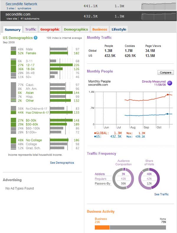 However, Quantcast tells us that 56% of Second Life visitors, at least in the US, earn less than $60k/year (27% earn less than $30k), and that 33% are under 18.