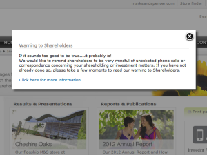 As a leading UK retailer, Marks and Spencer knows how to protect their customers. Recently they have included a popup that warns shareholders about scams. Ordinarily, many users consider a popup to be a nuisance, but this particular popup is effective in several ways.