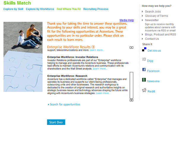 For example, on the right, you can see the first question of the Accenture careers quiz … and their recommendations for me, after I had completed the quiz. (Investor Relations or Research – they’re not far wrong there, are they?).