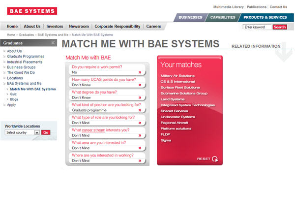 BAE Systems show you the options as you answer the questions (so you can see the consequences of, for instance, your decision not to travel); Accenture give you options after you have completed the quiz. Either one should give you the most appropriate job choice within that company.