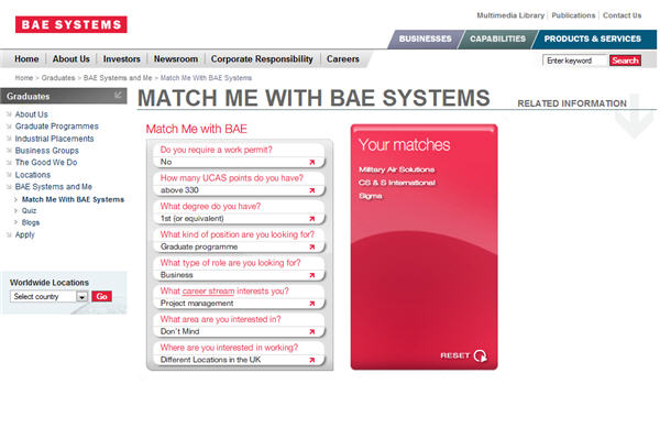 Some companies have come up with handy quiz-like tools, which end up recommending a particular start-point with the company based on the candidate’s answers to the questions. These tools, like the ones at Accenture or at BAE Systems, will help steer candidates in the right direction, and are a great alternative to endless paragraphs of text.