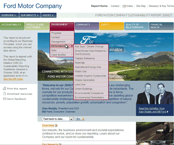 Finally I gave up and used the site’s in-built search facility. This revealed that Ford keeps their sustainability reports under in their corporate information section. A bit of a D’OH moment, but once there I was keen to press on.