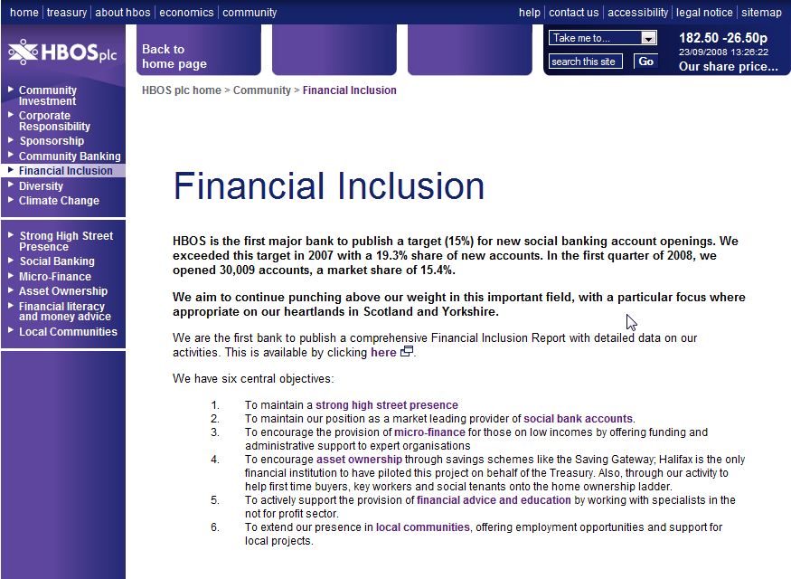 The in depth sections of both websites are very dry and uninformative. Both have links out to PDF documents; in HBOS’ case these are mainly reports and reviews while Lloyds TSB adds a good few policies to the mix.