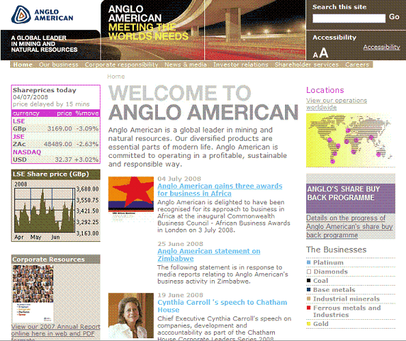 In addition, this link automatically expands to be a menu, allowing the visitor to gain access with a single click to topics ranging from Anglo American’s sustainability reports to its approach to HIV/AIDS.