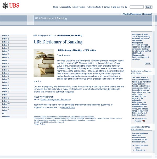 UBS provide definitions of over 2,400 banking terms – useful enough for finance students to bookmark independently of their main site, I should think.