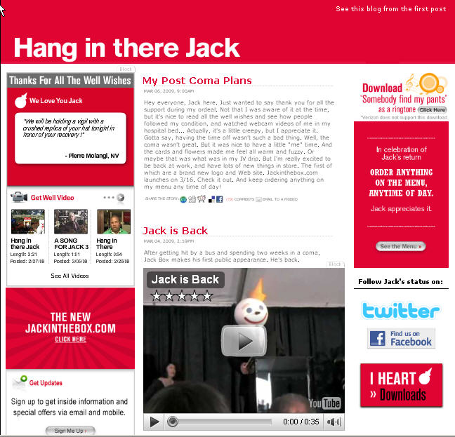 Finally, because I can’t resist, an update on Jack. As you may know, Mr. Box has recovered from his brush with death and is back at the helm. But did you know that JITB created a standalone website—HangInThereJack.com—for the campaign? In addition to a series of (hilarious) webisodes that follow the dramatic events surrounding Jack’s coma, the site offers ringtones and badges for the true Jack Fanatic, plus social media links.