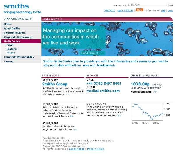 Smiths Group media centre. Although not exciting, their media centre does provide out of hours contact numbers for urgent media enquiries.