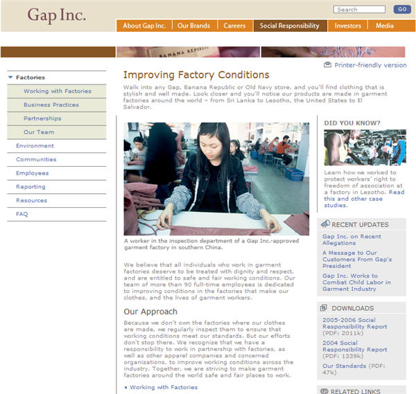 The introduction starts “At Gap Inc., we believe…” and there’s a quote from the Senior VP of Social Responsibility. Further content is presented blog-style, with the first paragraph content followed by “More” links to draw you in further.