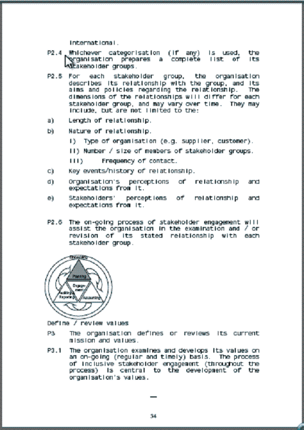 For example, one of the Planning processes is to identify an organisation’s stakeholders. As part of this, P2.5 states that the definition of a stakeholder may include not just the length and type of the relationship, but also both the organisation and the stakeholder’s perception and expectations of the relationship.