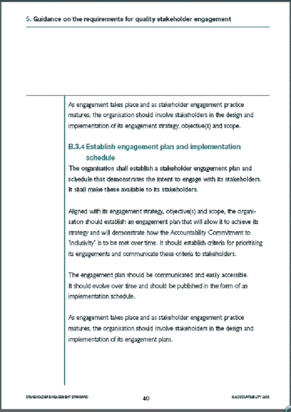 For example, when establishing a plan for engaging with its stakeholders (section B3.4), an organisation ought to ensure the following are observed: